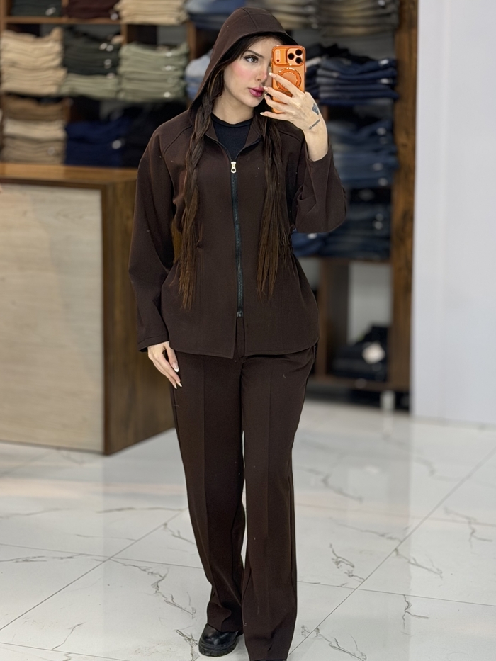 - 🟡سویشرت کلاهدار و جلو زیپ میخورد و کمر چین دارد: 🟡شلوار جلو دکمه و زیپ میخورد